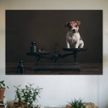 Engelse bulldog pup in het blauw / Brown and white english bulldog puppy in a colored basket on a t
