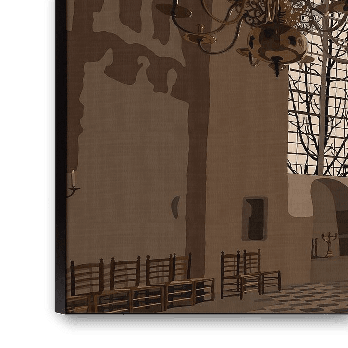 An den Wänden stehen einfache Holzstühle in einer strengen Anordnung, die zur Kontemplation einlädt. Ihre Platzierung unterstreicht den offenen Raum und führt den Blick auf natürliche Weise zum Altarbereich. Der künstlerische Stil balanciert zwischen Realismus und Stimmungsbildung: Das Spiel von Licht und Schatten, die Textur der Materialien und die ruhige Harmonie vermitteln ein Gefühl der Zeitlosigkeit.