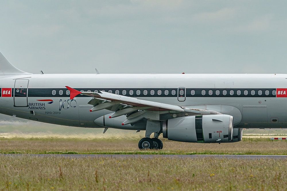 Anlässlich des 100-jährigen Jubiläums von British Airways (im Jahr 2019) trägt dieser Airbus A319 eine spezielle Retro-Lackierung: das Farbschema von British European Airways (BEA), das von BEA (dem Vorgänger von British Airways) in den 60er Jahren verwendet wurde.