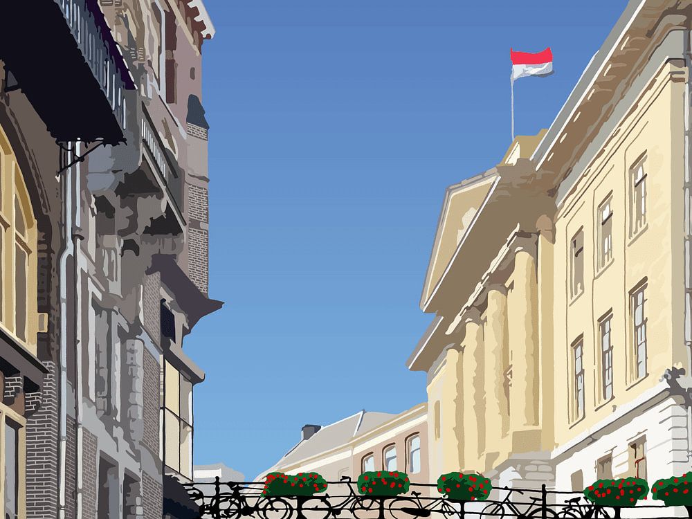 Unter einem strahlend blauen, völlig wolkenlosen Himmel entfaltet sich eine lebendige Szene der Stadhuisbrug in Utrecht, vom Wasser aus gesehen am Vismarkt. In der Mitte des Bildes erhebt sich das monumentale Rathaus, das mit seiner klassizistischen Fassade und den verzierten Details gut zu erkennen ist. An der Fassade wehen stolz eine Utrechter und eine niederländische Flagge, rot-weiß und rot-weiß-blau, die einen starken Kontrast zum hellblauen Hintergrund bilden. Außerdem ist an der Fassade ein großes Banner der Vuelta angebracht, ein farbenfroher und sportlicher Akzent, der dem historischen Gebäude ein modernes Flair verleiht.