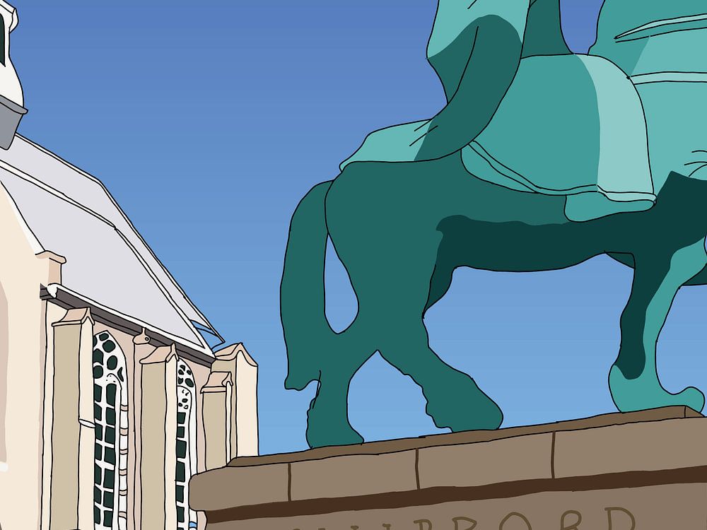 Unter einem strahlend blauen, wolkenlosen Himmel steht das stilisierte Bild von Willibrord im Mittelpunkt dieses digitalen Kunstwerks. Die Figur sitzt auf einem kräftigen Pferd. Beide sind in klaren, vereinfachten Linien und Flächen dargestellt, wobei ein subtiler metallischer Glanz den modernen Charakter der Skulptur unterstreicht. Willibrord hält ein maßstabsgetreues Modell einer Kirche hoch, das symbolisch für seine Missionsarbeit steht, während sich das Pferd stolz und energisch zu bewegen scheint, als sei es gerade zum Stillstand gekommen.