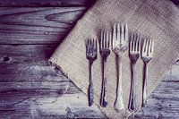 Besteck, Silber, Silberwaren, ländlich, grau, Holz, Antiquitäten, fünf, alt, beige, Restaurant, Essen, Essen, Stillleben, Gabel, Gabeln