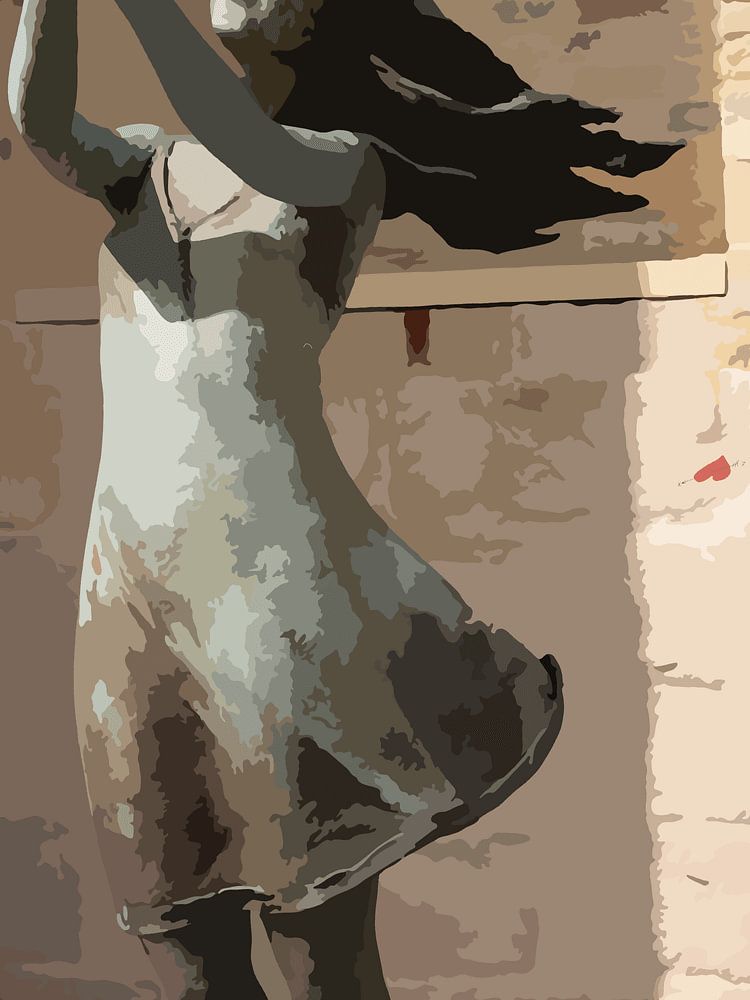 Die Sonne, die von links auf die Skulptur fällt, wirft einen warmen Schein auf ihr Gesicht und ihr leichtes Sommerkleid und erzeugt weiche Schatten, die ihren Ausdruck und ihre Haltung betonen. Ein Teil der verwitterten Steinmauer hinter ihr und das verwitterte Pflaster fangen dieses Sonnenlicht ebenfalls ein und verleihen dem Bild ein subtiles Spiel zwischen Hell und Dunkel. Der Rest der Szene - der Hintergrund, die Ecken und die linke Seite des Werks - bleibt in kühle Schatten gehüllt, wodurch die beleuchteten Teile umso lebendiger wirken.