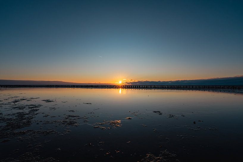 Ich habe dieses Foto während des Sonnenuntergangs aufgenommen, an einem Winternachmittag um 16:37 Uhr. Der Moment, in dem das Licht gerade noch vorhanden ist, aber schon deutlich verschwindet. Ich habe eine zentrale Komposition gewählt, in der Sonne, Horizont und Spiegelung in einer ruhigen Linie zusammenkommen.