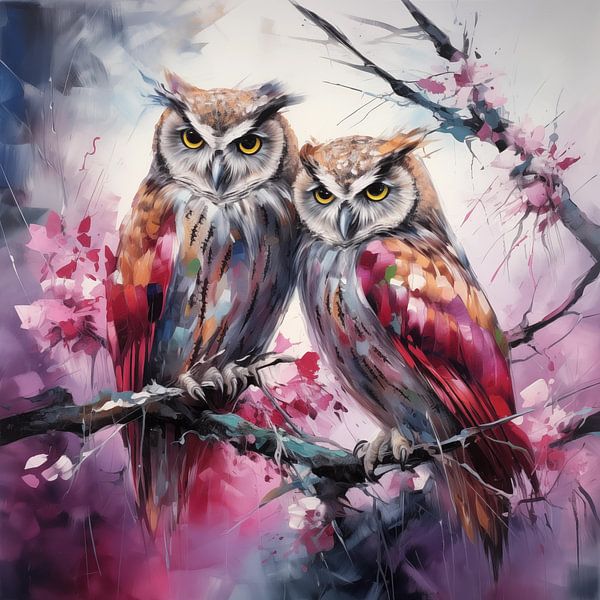 Einzigartige 2 Eulen in Rosa mit einem künstlerischen Stil. Mit schönen Farbtönen und einem einzigartigen Design ist dies ein stilvoller Fotodruck, der in jedem Raum gut aussieht. 100% einzigartig und originell!
