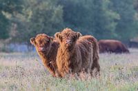 2 Neugierige schottische Hochlandkälber in der Umgebung des Stroomdallandschap de Drentse AA in Oudemolen/Gasteren
