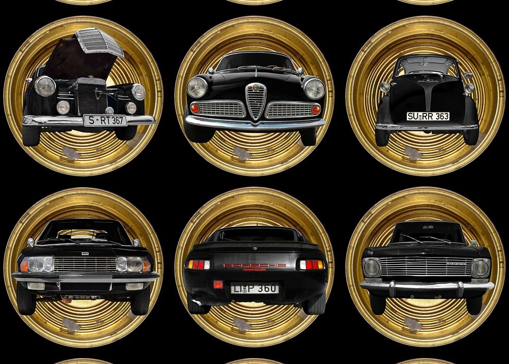 20 Oldtimer auf einem Poster die innerhalb von 50 Jahren von 1936 bis 1986 gebaut wurden.