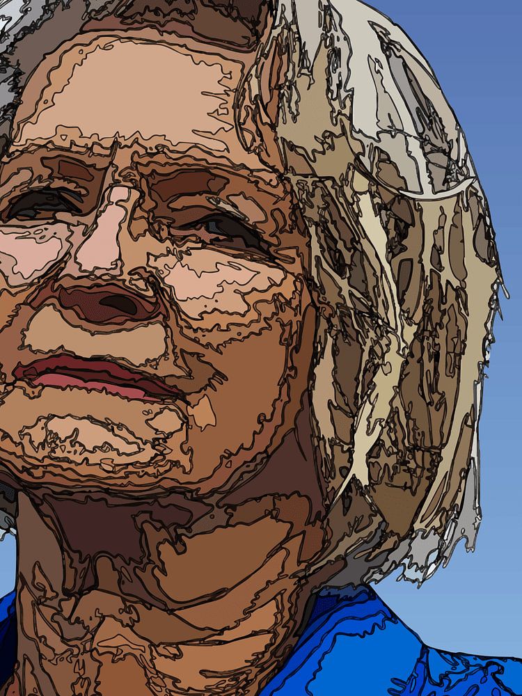 Dieses digitale Kunstwerk zeigt eine ausdrucksstarke Porträtillustration einer älteren Frau, die in einem Stil wiedergegeben ist, der an Vektorkunst oder eine digitale Maltechnik mit starken Konturlinien erinnert. Das Porträt besteht aus reichhaltig schattierten Farbflächen und dunklen Konturen, die die Gesichtsstruktur, die Falten und die Textur der Haut betonen. Die Frau trägt ein hellblaues Hemd, das mit den eher erdigen und warmen Hauttönen von Gesicht und Hals kontrastiert. Ihr silbergraues Haar ist locker frisiert und fängt das Licht auf subtile Weise ein, was dem Porträt zusätzliche Tiefe verleiht.