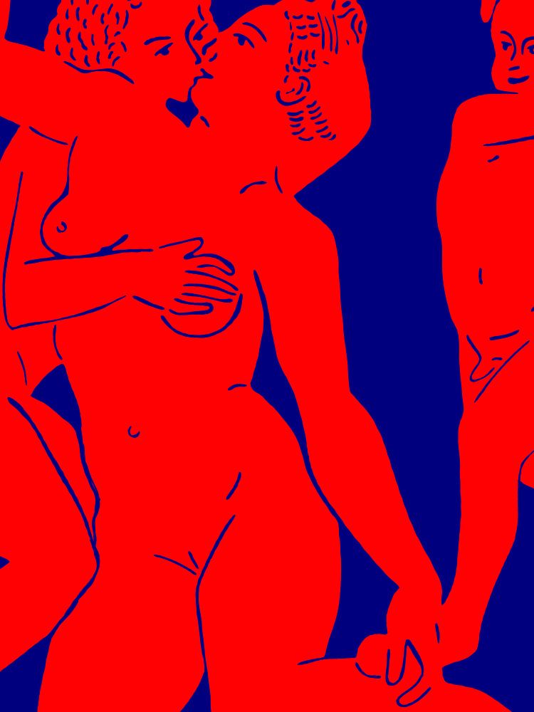 Das Werk spielt mit Themen wie Liebe, Körperlichkeit und der Spannung zwischen öffentlich und privat. Die Verwendung einer minimalistischen Farbpalette und der Verzicht auf Details betonen die Haltung und die Interaktion der Körper und verstärken die Ausdruckskraft. Gleichzeitig wirft das Werk Fragen über die Rolle der Sexualität in der Kunst und die heutige Neuinterpretation historischer Motive auf.