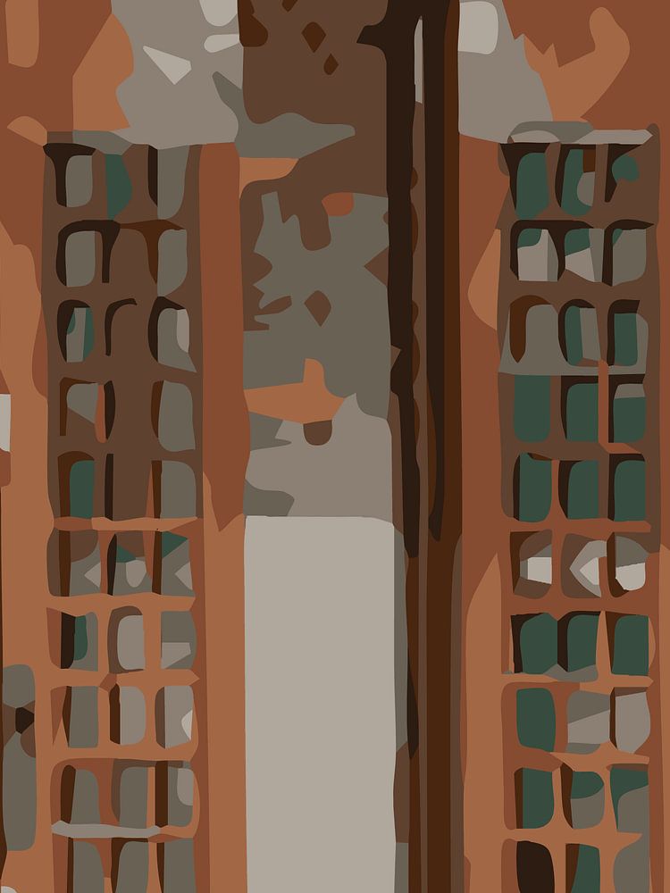 Dieses digitale Kunstwerk zeigt eine stilisierte und abstrakte Darstellung der Fassade eines historischen Post- und Telegrafenamtes in Utrecht. Über den Doppeltüren sind die Worte "POSTERYEN" und "TELEGRAFIE" in charakteristischer Typografie zu lesen, ein direkter Verweis auf die Funktion des Gebäudes zu einer Zeit, als Post und Telegrafie wesentliche Kommunikationsmittel waren. Das Bild ist in einem digitalen Malstil mit vereinfachten Formen und einer begrenzten Farbpalette aufgebaut.