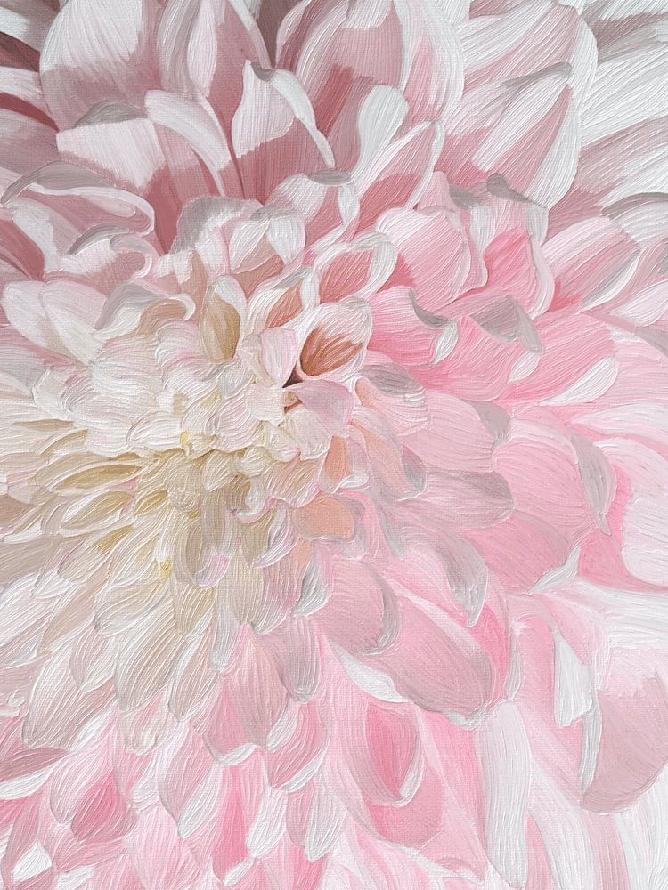 Der Hintergrund des Kunstwerks ist ein gleichmäßiges, dunkleres Rosa, das einen schönen Kontrast zu den helleren Tönen der Chrysantheme bildet. Dieser schlichte Hintergrund sorgt dafür, dass die Blume die volle Aufmerksamkeit erhält und verstärkt die romantische Stimmung des Werks. Die Verwendung eines schlichten Hintergrunds verleiht dem Kunstwerk ein modernes und minimalistisches Aussehen, wodurch die Schönheit und die Details der Blume noch besser zur Geltung kommen.
