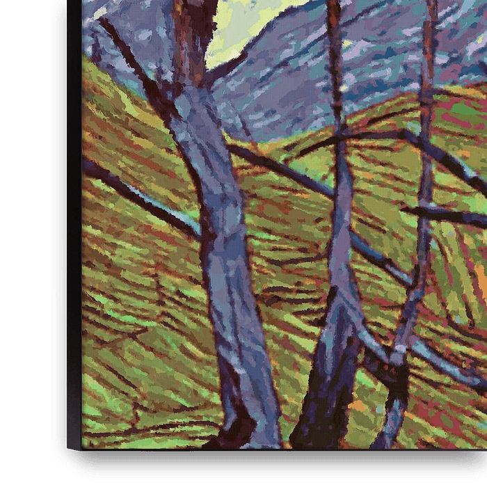 Bestelle dieses Landschafts-Wandbild 7 Sonnen, ein Berg & ein Tal mit kahlen Bäumen von Anna Marie de Klerk als Reproduktion auf Leinwand, Alu-Dibond, als Poster, Fototapete oder Acrylglasbild.