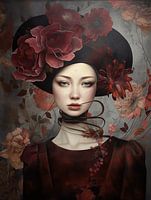 Weibliches Porträt, in dem die Frau prächtigen Blumenschmuck trägt, welcher in dunklem Rot gehalten ist. Der Blumenschumuck besteht aus gedämpften, tiefroten Blumen und Blättern, die eine kraftvolle, aber dennoch sanfte Ausstrahlung verleihen. Ihr Gesicht ist von den Blättern umrahmt, was ihr eine mystische, fast königliche Erscheinung…