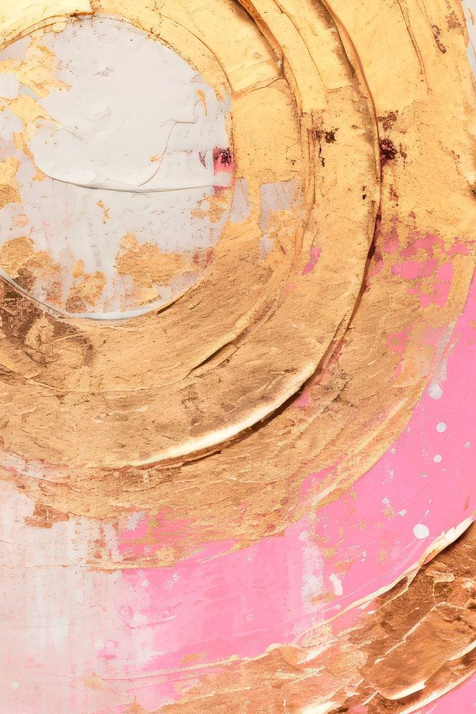 Minimalistische Kunst mit goldenen Kreisen und einer Textur in zartrosa und weiß. Das abstrakte Design soll eine entspannende Stimmung erzeugen. Die Farbe sorgt für ein tolles Raumklima und unterstützt uns dabei zu innerer Ruhe und Gelassenheit zu finden.