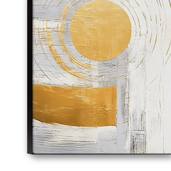 Moderne Kunst mit goldenen geometrischen Formen, darunter Kreise und Linien, heben sich von einem gedämpften, abstrakten Hintergrund ab. Das Design zeigt eine minimalistische Ästhetik mit einer Mischung aus metallischem Glanz und sanften neutralen Tönen. Dieses abstrakte Gemälde strahlt eine zeitlose, besinnliche Ruhe aus. Die Farben…
