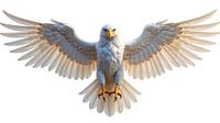 Mit ausgebreiteten Schwingen erhebt sich der Adler in einer Pose absoluter Kontrolle und erhabener Kraft. Die Komposition ist symmetrisch und klar, jede Feder präzise definiert und in sanftes Licht getaucht, das die Struktur wie eine fein gearbeitete Skulptur hervorhebt. Das Weiß des Gefieders wirkt rein und nahezu monumental, während…