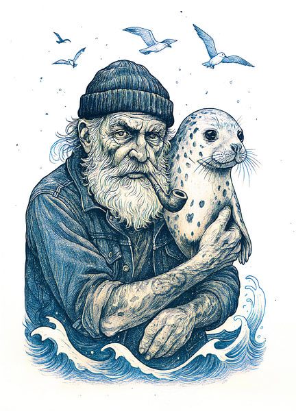 Bestelle dieses Vögel Wandbild Älterer Seemann mit Robbe von ArtMomente als Reproduktion auf Leinwand, Alu-Dibond, als Poster, Fototapete, ArtFrame oder Acrylglasbild, maßgefertigt in höchster Qualität.