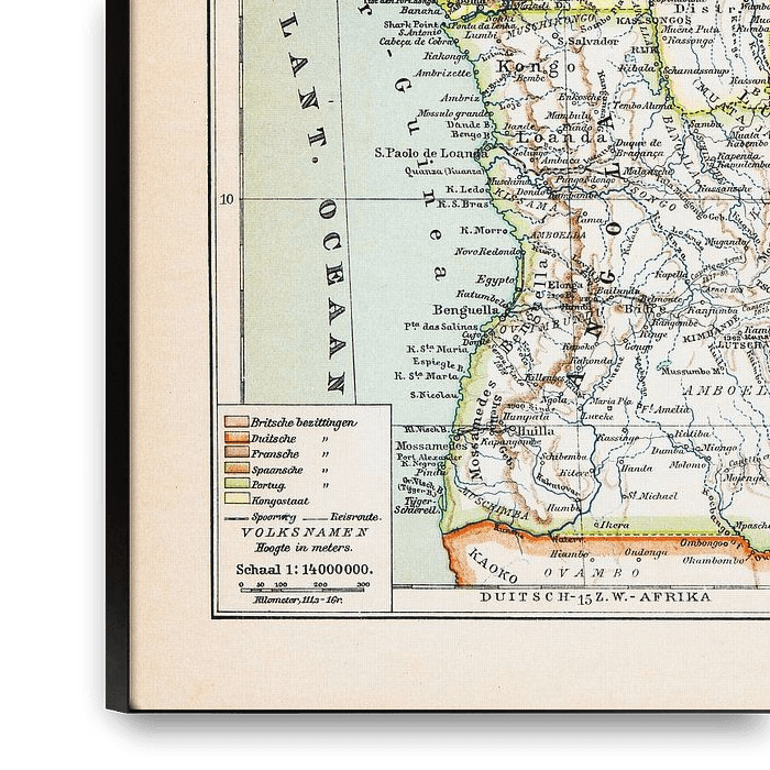 Diese antike Karte aus der Zeit um 1900 zeigt den Teil Afrikas um den Äquator zu Beginn des 20. Jahrhunderts. Jahrhunderts. Sie ist somit eine Darstellung der Kolonialmächte und der Aufteilung dieses Teils des afrikanischen Kontinents.