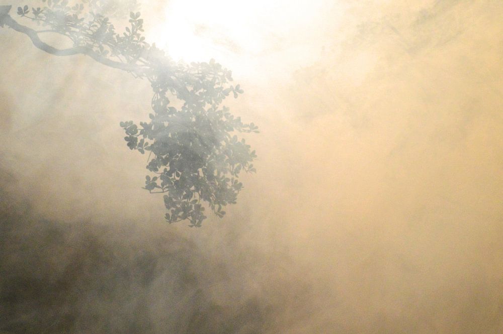 Zweige eines Baumes verschwinden in den Rauch. Die Zweige sind gerade noch sehen, durch den dichten Rauch. Das Licht, das schöne Schatten durch den Rauch und den Niederlassungen produziert verleiht ihm eine besondere, vielleicht mystische Aura. Das Bild ist ein schöner Baum schlagen vor, verschwindet in den Nebel, aber auch ein Baum, der in seiner Existenz durch einen Waldbrand bedroht ist. Ein ganz besonderes Bild.