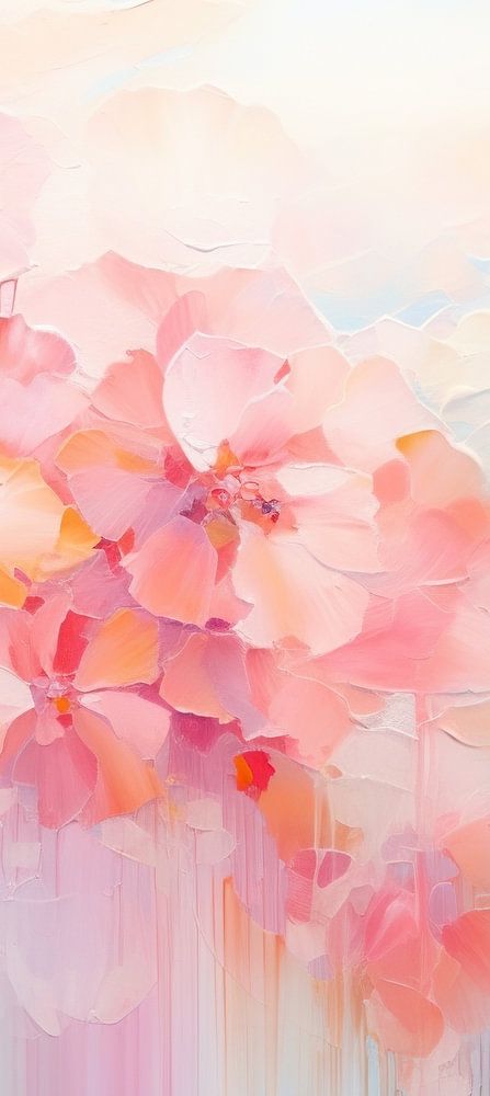 Ethereal | Floral Artwork - Auf der Leinwand blühen zarte, ätherische Blumen in einer gedämpften Palette von Rosa- und Orangetönen, die in einen ruhigen hellblauen Hintergrund übergehen. Die Pinselstriche sind ausdrucksstark und die Farbe ist dick aufgetragen, was den Blumen eine fast dreidimensionale Qualität verleiht, die Ruhe ausstrahlt.