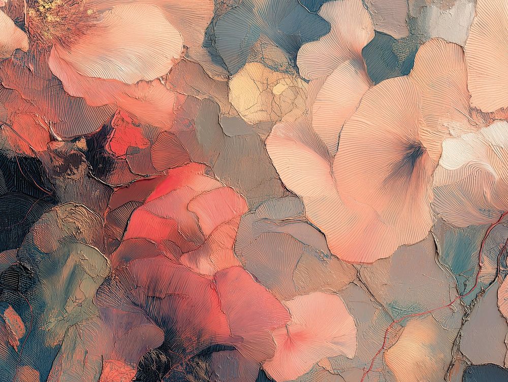 Ein verträumtes, abstraktes Blumenkunstwerk mit zarten Blüten in Rot und Pfirsich, die sich über kühle blaue und schieferfarbene Texturen legen und Ruhe, Eleganz und ein Gefühl von sanfter Bewegung hervorrufen.