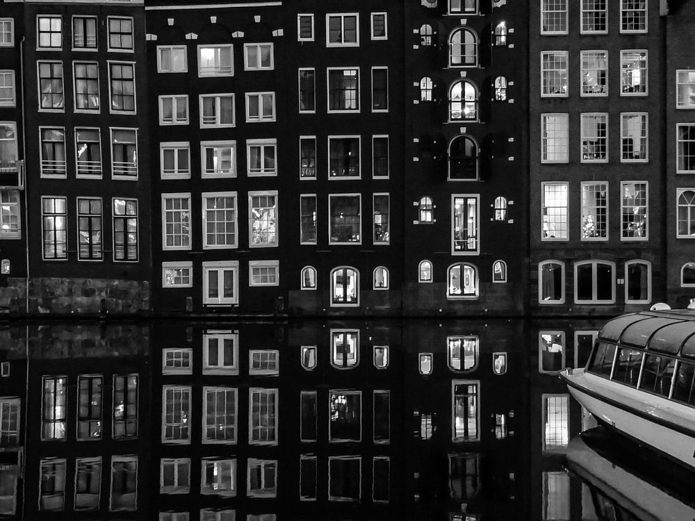 Abend in Amsterdam in schwarz-weiß, Damrak