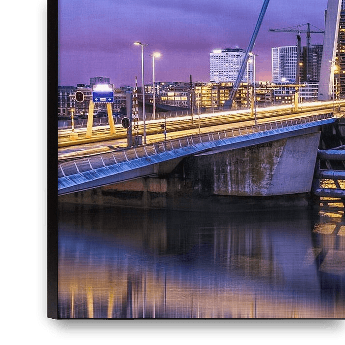 Bestelle dieses Rotterdam-Wandbild Abendaufnahme der Skyline von Rotterdam und der Erasmus-Brücke. von Bart Ros als Reproduktion auf Leinwand, Alu-Dibond, als Poster, Fototapete oder Acrylglasbild.