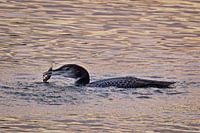 Besondere Nahaufnahme eines Eistauchers mit einem Hummer im Schnabel, fotografiert im sanften Licht der Abenddämmerung. Die zurückhaltenden Farben und der Moment der Jagd sorgen für ein kraftvolles und seltenes Bild.