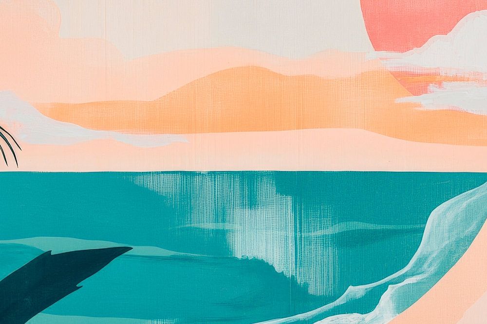 Ein sanfter Sonnenuntergang taucht die sanften Wellen in warmes Licht und lädt zu Tagträumen am Meer ein. Grünes tropisches Blattwerk und pastellfarbene Akzente verleihen dem Szenario eine entspannte Atmosphäre. Dieses Bild harmoniert perfekt im Wohnzimmer oder Schlafzimmer, wo es sowohl Ruhe als auch eine Prise Urlaub ins Zuhause bringt.