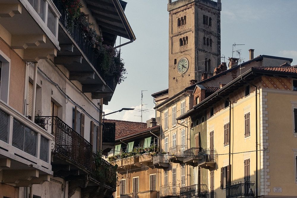 Wenn die Sonne über der malerischen Stadt Masserano in Biella, Piemont, Italien, untergeht, werden die alten Gebäude und malerischen Straßen in ein goldenes Licht getaucht. Die ruhige Szene wird durch die Silhouette des Turms der Kirche der Verkündigung unterstrichen, die der charmanten italienischen Stadt einen Hauch von zeitloser Eleganz verleiht.