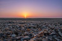 Während die Sonne langsam über dem Strand von Noordwijk untergeht, färbt sich der Himmel in sanften Rosa-, Blau- und Violetttönen. Das Licht spiegelt sich dezent auf dem Sand und zwischen den Muscheln wider, wodurch jedes Detail zum Leben erwacht.