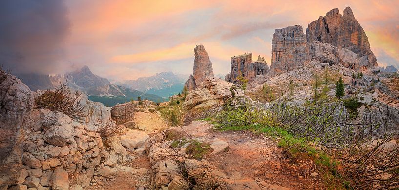 wundervolle Abendstimmung an den Cinque Torri. Alpenlandschaft Dolomiten, Südtirol.