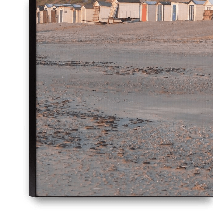 Strandhäuschen stehen aufgereiht im sanften Licht der untergehenden Sonne auf der Insel Texel am Paal 15