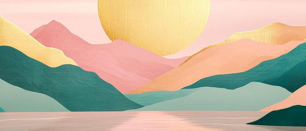 Sanfte Hügelkügeln in pastel Farben, mit einem majestätischen goldenen Sonnenaufgang, laden zur Träumerei ein. Die harmonische Spiegelung im Wasser verleiht dem Raum eine ruhige Atmosphäre. Dieses Kunstwerk eignet sich perfekt für das Schlafzimmer, um eine entspannende und friedliche Stimmung zu schaffen.