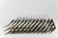Abstracte verzameling van metalen vorken in een rij als achtergrondfoto