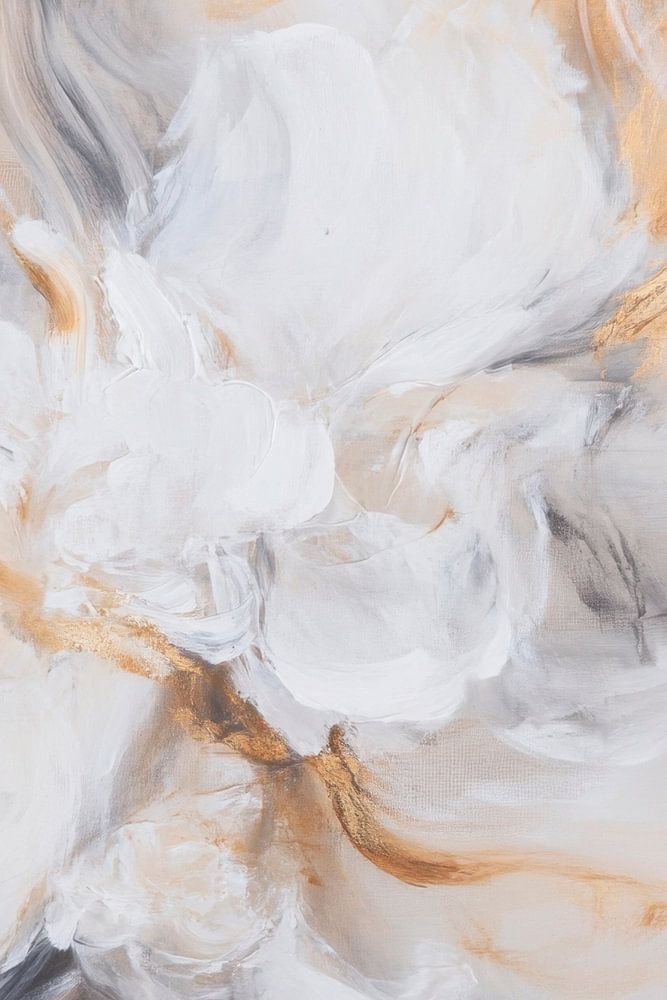 Ein faszinierendes Spiel aus sanften Weiss- und Grautönen entfaltet sich, durchzogen von zarten goldenen Akzenten. Die dynamischen Pinselstriche erzeugen eine fast etherealische Bewegung, die den Betrachter in eine Traumlandschaft entführt. Diese harmonische Verschmelzung von Licht und Schatten lädt zum Verweilen und Träumen ein.