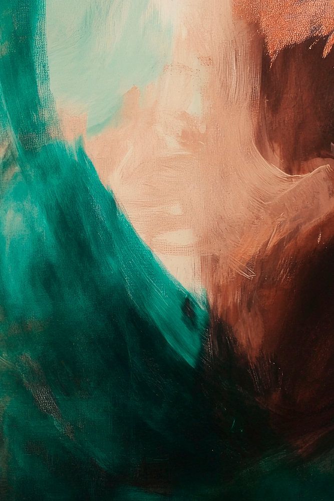 Eine harmonische Farbkomposition aus tiefem Teal und sanften Erdtönen entfaltet sich in dynamischen, fließenden Formen. Die warme, einladende Atmosphäre lässt den Betrachter innehalten und gibt Raum für Kreativität und Inspiration. Ideal für das Wohnzimmer oder das Büro, wo es die Sinne anregt und die Konzentration fördert.