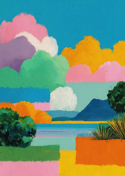 Dieses abstrakte Landschaftsgemälde zeigt einen leuchtend blauen Himmel mit großen, fluffigen Wolken in Rosa, Gelb und Weiß über einem ruhigen Wasserband in Blau- und Rosatönen. Der Vordergrund besteht aus horizontalen Farbblöcken in Grün, Pink, Blau und Orange, die das Land darstellen. Rechts unten ergänzen dunkle grüne Pflanzen das…