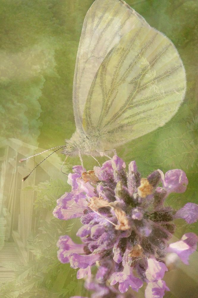 Dieses Werk zeigt einen Schmetterling, der sich auf dem Geländer einer Holzbrücke in einem bewaldeten Gebiet ausruht. Sie können auch sehen, Schmetterling ruht auf lila Stacheln eines Lavendel.