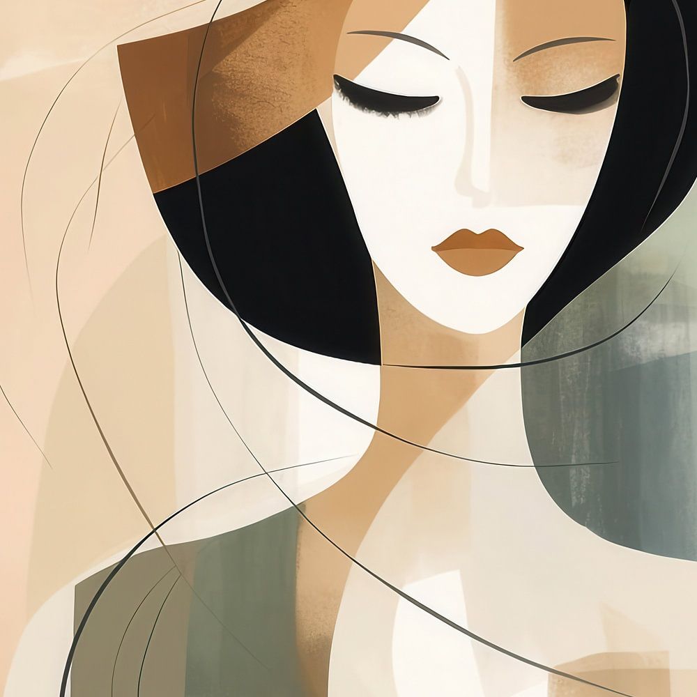 Dieses abstrakte Gemälde stellt die Silhouette einer Frau in einem Stil dar, der durch gedämpfte Erdtöne gekennzeichnet ist. Die Kunstwelt dieses Werks umfasst geometrische Formen des Art déco und kontrastierende harte und weiche Linien. Die gefühlsbetonten Gesichter verleihen dem Ganzen einen tiefen Sinn für Eleganz.