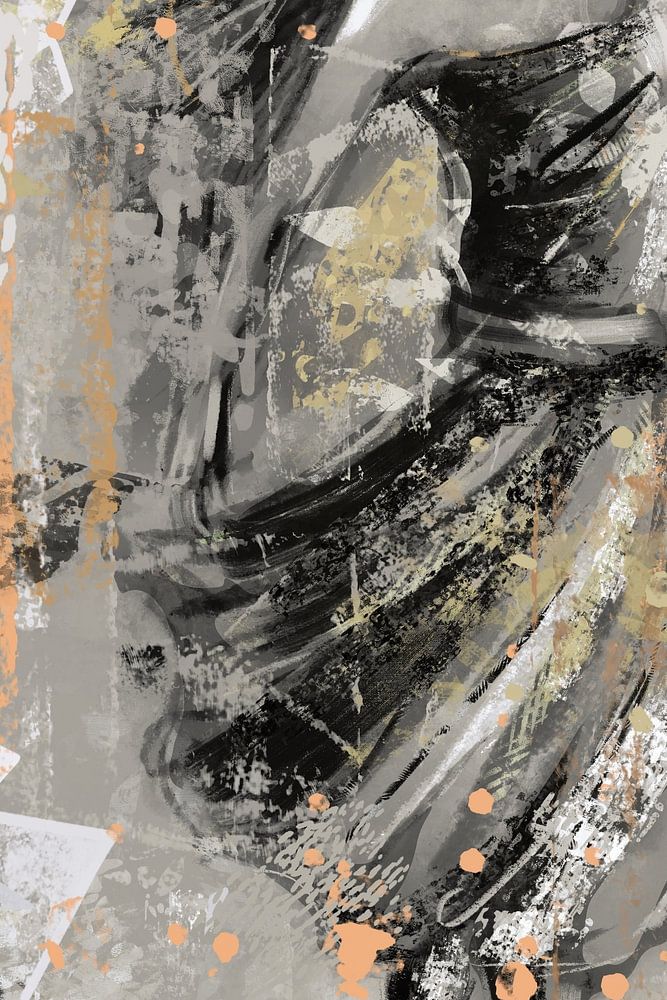 Ein halb-abstraktes Kunstwerk in Grau-Orange und Ocker-Gelb. Die Frau trägt ein Kleid und hat lange Haare, die im Wind tanzen.