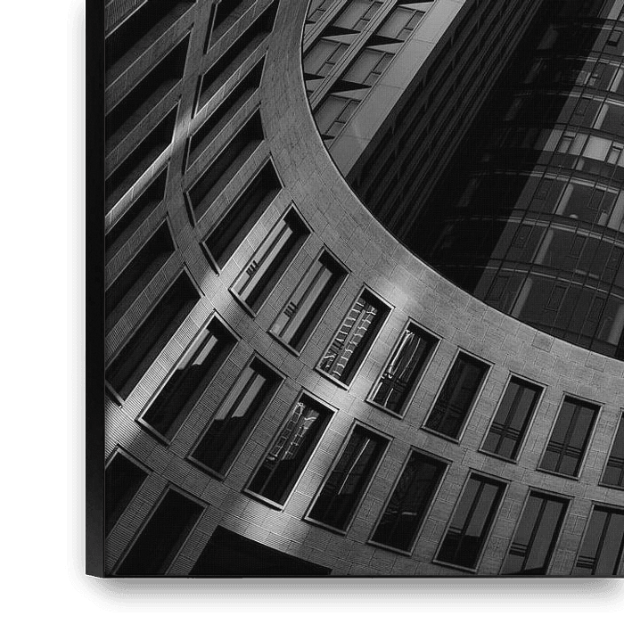 Ein Schwarzweiss-Foto von Gebäuden in Frankfurt am Main in Deutschland. Ein abstraktes Bild von zwei Gebäuden.