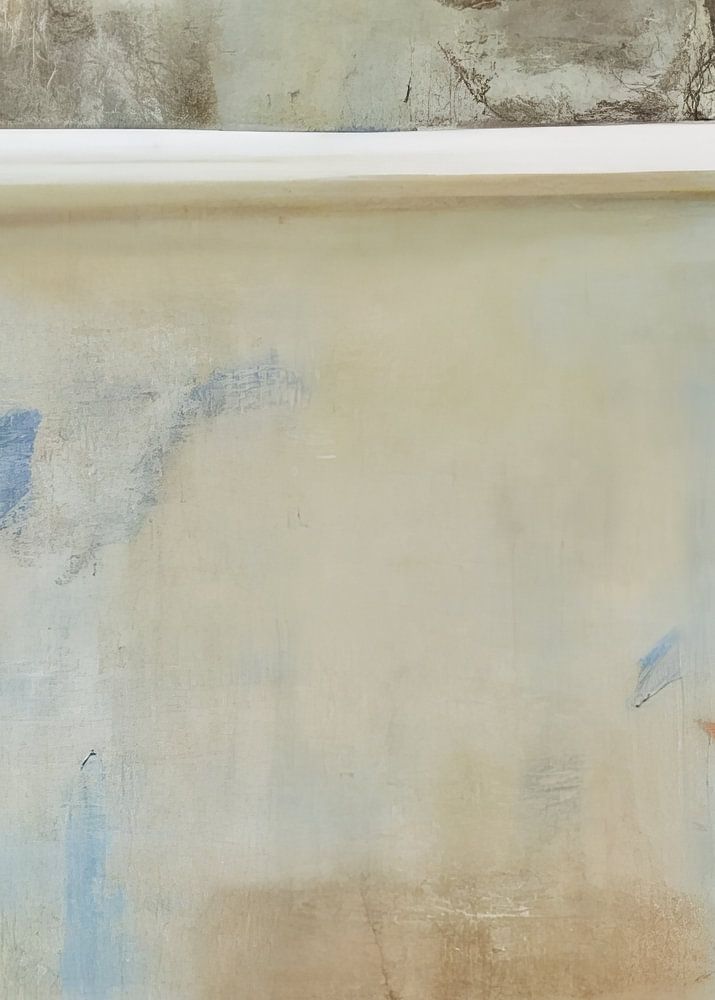 Abstrakte Komposition, Pastell. Mixed Media Art: In diesem Werk habe ich verschiedene Materialien und Techniken kombiniert, um ein minimalistisches und abstraktes Werk in Pastellfarben zu schaffen.