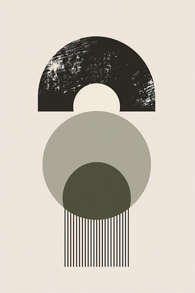 Entdecken Sie die Gelassenheit dieses abstrakten Kunstwerks, in dem sich einfache geometrische Formen und sanfte Farbübergänge zu einer stilvollen Komposition vereinen. Die Kombination aus Kreisen und Halbbögen vor einem cremefarbenen Hintergrund strahlt eine ruhige und minimalistische Atmosphäre aus. Die dunkleren Töne bilden einen schönen Kontrast zu den helleren Elementen, während die stilisierten Streifen im Vordergrund ein Gefühl von Tiefe und Textur vermitteln. Dieses Stück ist ein subtiles Herzstück, das jeden modernen Wohn- oder Büroraum ergänzen kann. Es passt besonders gut in Innenräume, die Wert auf klare Linien und eine unkomplizierte Ästhetik legen.