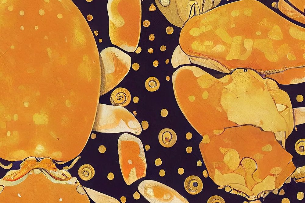 Ein farbenfrohes digitales Gemälde mit abstrakten Krabben im Stil von Gustav Klimt. Dieses Werk ist von den Formen und der Farbpalette von "The Kiss" inspiriert. Das Werk verleiht Ihrem Interieur ein warmes und klassisches Aussehen!