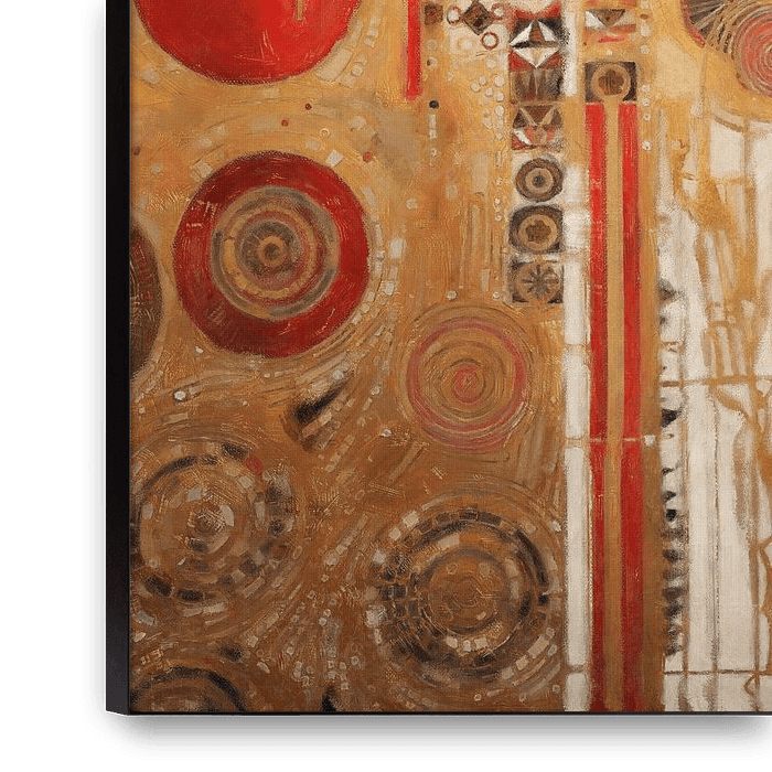 Dieses Werk zeigt eine dynamische Komposition aus kreisförmigen Mustern in leuchtenden Rot- und Goldtönen. Die verschiedenen Kreise überschneiden sich und interagieren miteinander, was ein Gefühl von Bewegung und Energie hervorruft. Die Texturen und Linien innerhalb der Kreise und um sie herum verleihen dem Werk eine Tiefe und…