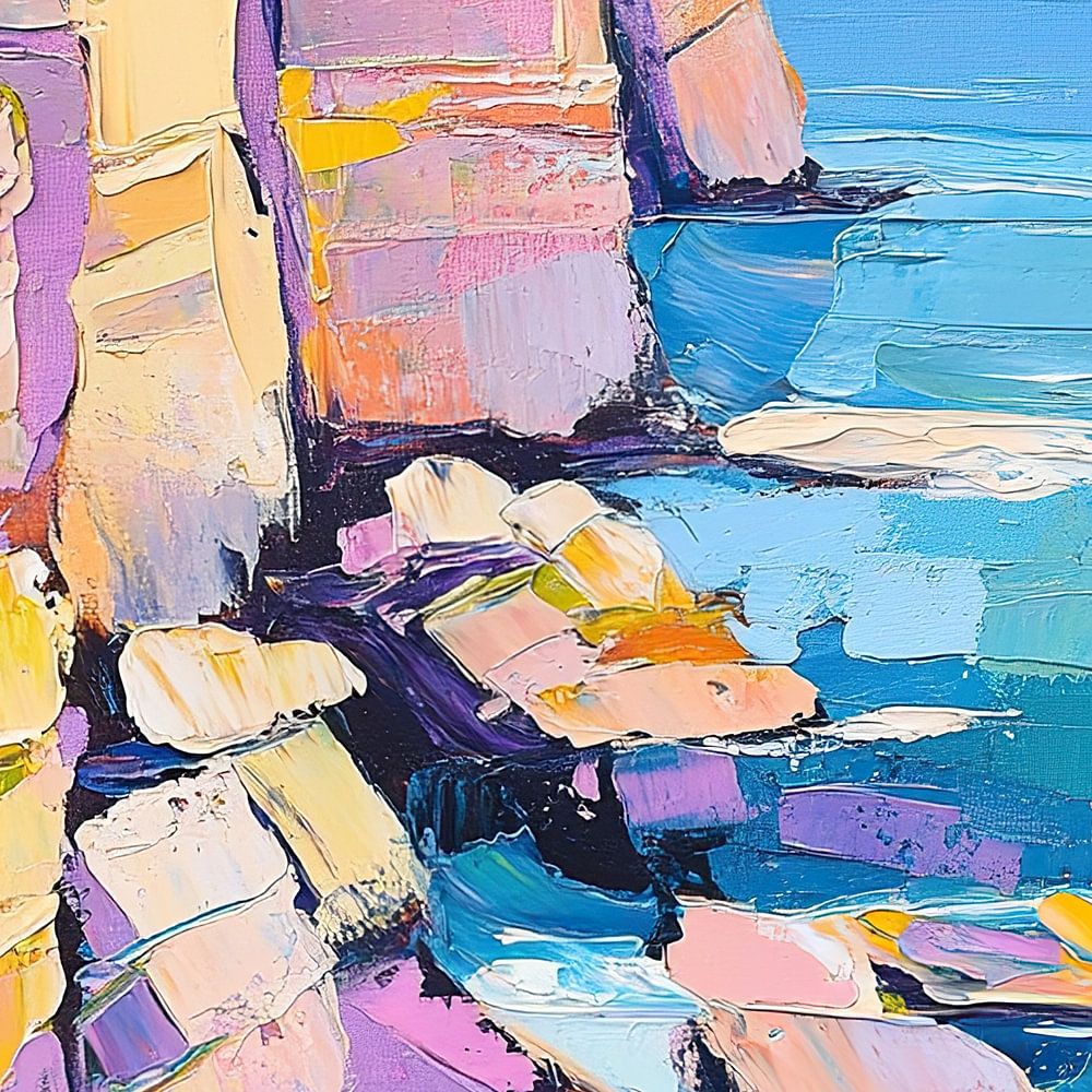 Details: abstraktes Gemälde, Küstenklippen, moderne Kunst, abstrakte Kunst, farbenfrohes Gemälde, Kunstgalerie, Wanddekoration, Innenarchitektur, Kunstsammlung, Küstenlandschaft
