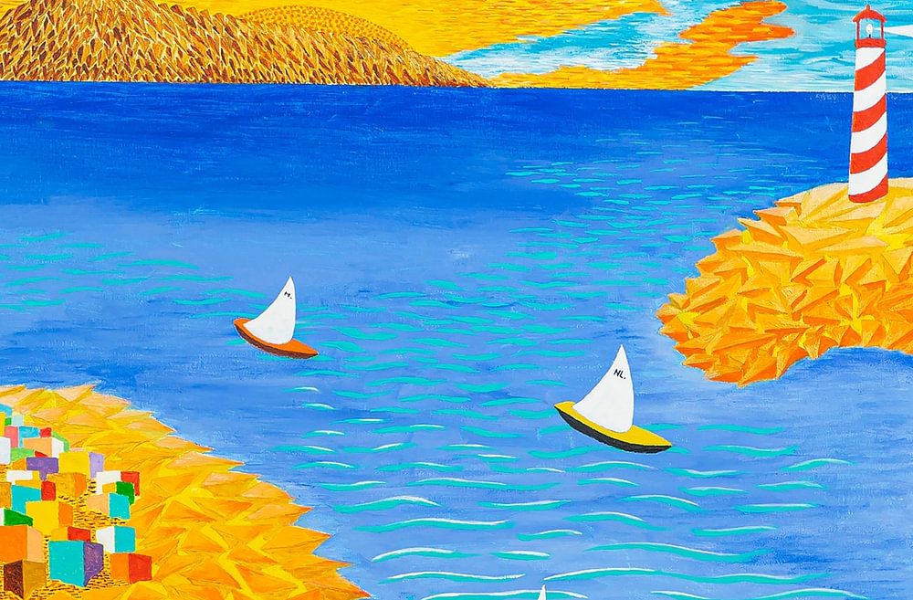 Mit einer originellen und persönlichen Technik habe ich mir eine Küstenlandschaft mit Bergen und einem Bergdorf, Inseln, einem Leuchtturm und Segelbooten vorgestellt.