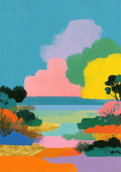Dieses abstrakte Landschaftsgemälde besticht durch kräftige, flache Farben und vereinfachte Formen. Der Himmel ist blau mit horizontalen Bändern in Teal, Grün, Hellblau und Pink, darüber ein pastellfarbenes rosa Wolkenmotiv. Die Landschaft besteht aus farbigen Flächen in Orange, Blau, Pink, Lila und Grün, die Felder und Gewässer…