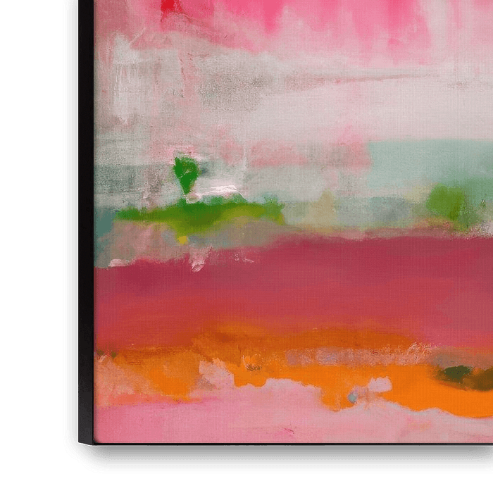 Abstraktes Gemälde mit Neon-Vibes in Rosa. Bei der Gestaltung dieses abstrakten Werks wurden verschiedene Farbtöne verwendet: zartes Rosa, helles Rosa, Weiß, Hellblau, Orange und Grün. Alle Farben zusammen bilden eine außergewöhnliche Farbpalette. Schön im Großformat!